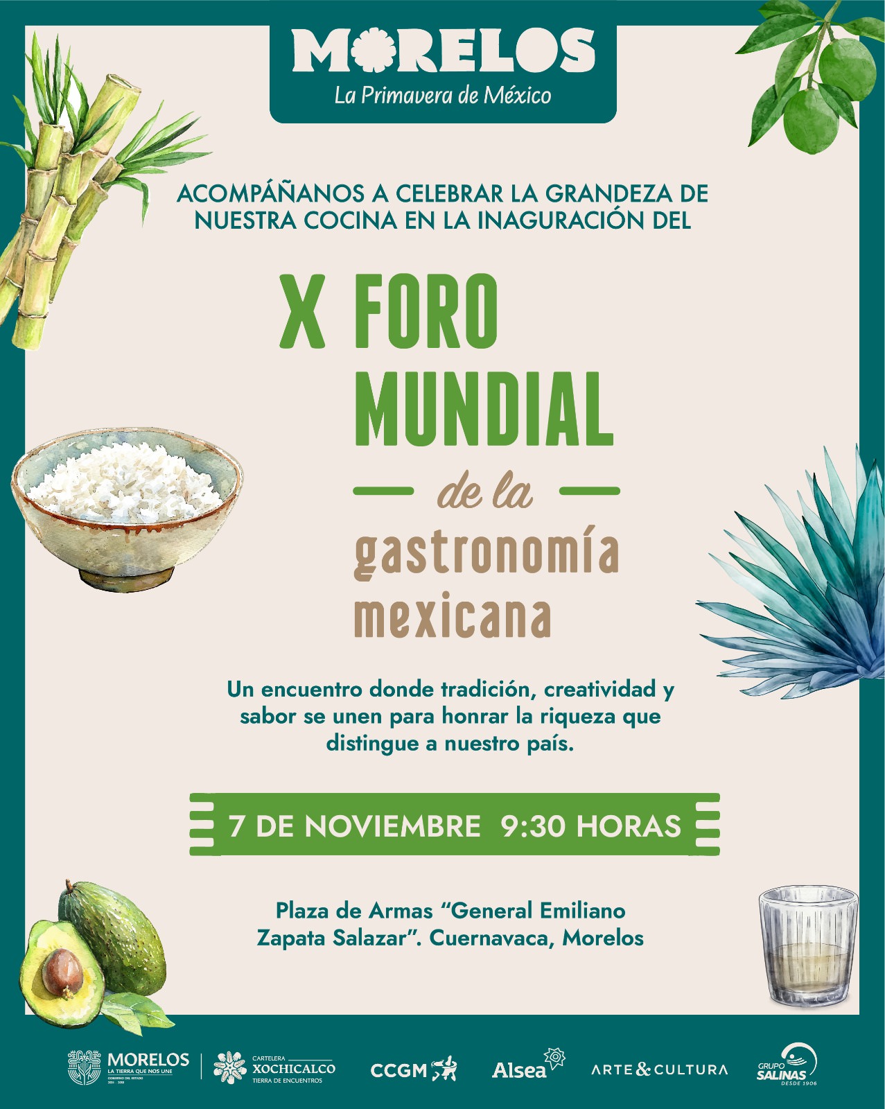 Del 7 al 9 de noviembre, Morelos será sede del X Foro Mundial de la Gastronomía Mexicana, un evento de talla internacional organizado por la Secretaría de Turismo y el Conservatorio de la Cultura Gastronómica Mexicana (CCGM).